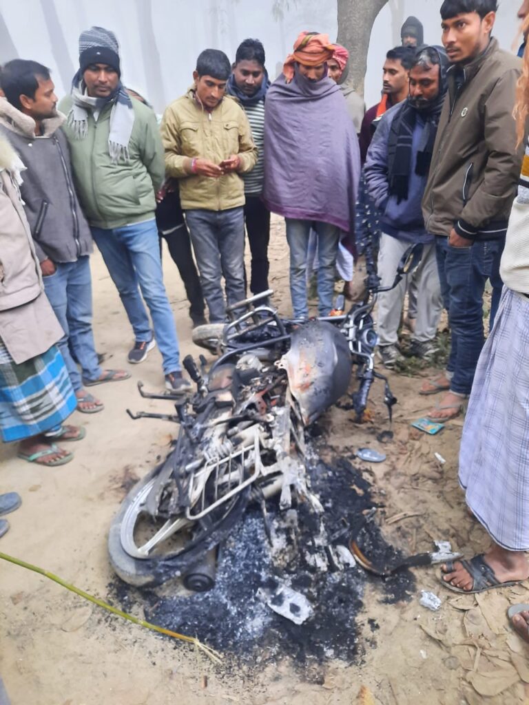 वीरपुर और सिंघौल थाना क्षेत्र से सटे कारीचक चौक स्थित गाछी में अज्ञात चोरों ने एक बाइक चोरी कर जला डाला।सुबह जब लोगों ने देखा कि एक बाइक जल रही है और उससे धुआं उठ रहा। जिससे क्षेत्र में सनसनी फ़ैल गई और देखते ही देखते दर्जनों लोग जमा हो गए। स्थानीय लोगों के द्वारा घटना की सूचना 112 को दी गई। वहीं सूचना पाकर मुफस्सिल थाना क्षेत्र के चिलमिल वार्ड नं 02 निवासी अभिनव कुमार व उसके घर वाले पहुंच कर अपने बाइक होने की पुष्टि की।साथ ही बताया कि रात में अपनी बाइक BR09T-0659 को अपने दरवाजे पर लगाया था।,जिसे अज्ञात चोरों द्वारा चोरी कर यहां लाया गया और जला दिया गया है। वहीं सिंघौल थाना की पुलिस आगे की कार्रवाई और मामले की जांच में जुट गई है।