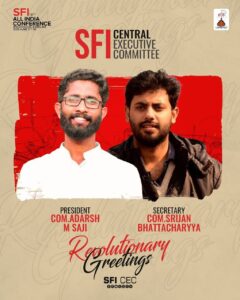 एसएफआई के नव निर्वाचित अध्यक्ष और महासचिव को बधाई SFI का 18वां ऑल इंडिया कॉन्फ्रेंस 27-30 जून, 2025 को कोझिकोड, केरल में संपन्न हुआ। इस सम्मेलन ने कॉमरेड आदर्श एम साजी को अध्यक्ष और कॉमरेड सृजन भट्टाचार्य को महासचिव के रूप में चुना है।