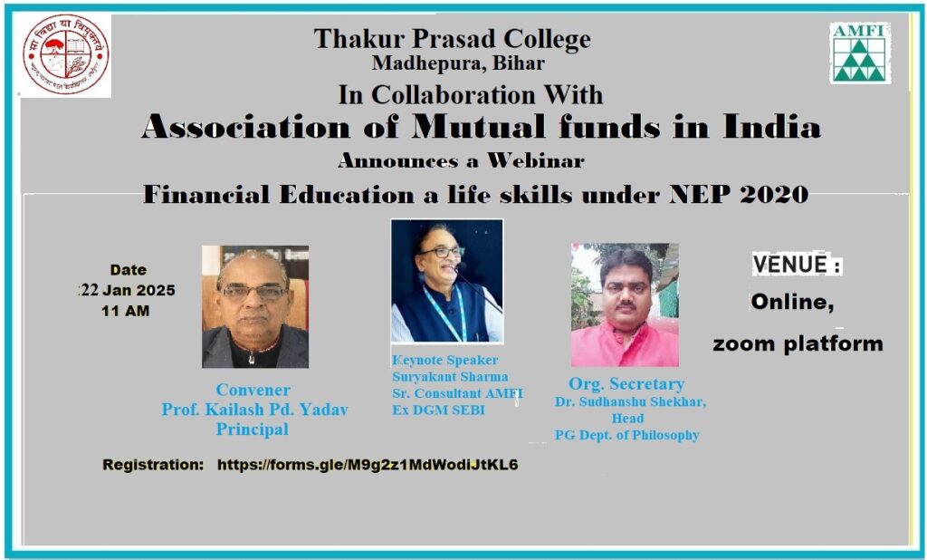 ठाकुर प्रसाद महाविद्यालय, मधेपुरा के तत्वावधान में बुधवार को एक ऑनलाइन वेबिनार का आयोजन किया जाएगा। वेबिनार का विषय “फायनेन्शियल एजुकेशन: ए लाइफ स्किल अंडर एनईपी-2020” होगा। इसमें सेबी के पूर्व डीजीएम एवं एएमएफआई के सीनियर कंसल्टेंट सूर्यकांत शर्मा मुख्य वक्ता के रूप में शामिल होंगे। वेबिनार का उद्घाटन प्रधानाचार्य प्रो. कैलाश प्रसाद यादव करेंगे, और धन्यवाद ज्ञापन दर्शनशास्त्र विभागाध्यक्ष डॉ. सुधांशु शेखर देंगे।