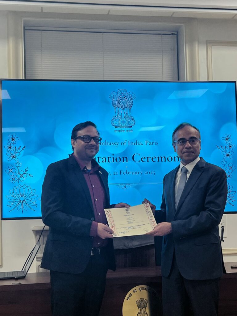 नितिन श्रीवास्तव को यह पुरस्कार फ्रांस में भारत के माननीय राजदूत श्री संजीव सिंगला द्वारा प्राप्त हुआ