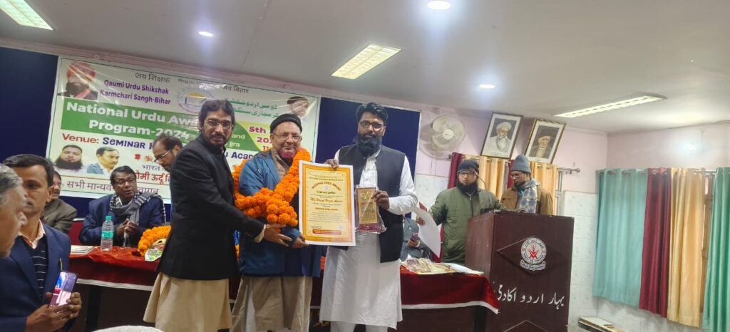 वीरपुर प्रखंड के मुजफ्फरा उत्क्रमित मध्य विद्यालय के स्नातक ग्रेड के शिक्षक मो वशी उल हक अंसारी को 5 जनवरी 25 रविवार को पटना में बिहार सरकार के मारूफ इदारा उर्दू एकेडमी कौमी उर्दू शिक्षक कर्मचारी संघ भारत द्वारा उर्दू के क्षेत्र में बेहतरीन योगदान देने से नेशन उर्दू आवार्ड से राष्ट्रीय अध्यक्ष चौधरी वाशील अली गुज्जर, कौमी तंजीम के मारूफ कलमकार जनाव गीरीडीहबी के हाथों सम्मानित किया गया।इस अवसर पर चर्चित उर्दू साहित्यकार फखरूद्दीन आर्फी,वैयतुलला अंसारी,जैनुल अवादीन,सगूफ्ता अवासीन व उर्दू अकादमी के पदाधिकारी के अलावे बिहार सरकार के अरशद फिरोज समेत अन्य गणमान्य व्यक्ति मौजूद थे। वशी उल हक अंसारी को यह अवार्ड मिलने से डॉ हस्मत, मोहम्मद वसीम, मोहम्मद कादिर, मोहम्मद अफरोज आदि लोगों ने संस्था समेत वशी उल हक अंसारी को बधाई व धन्यवाद दिया है।