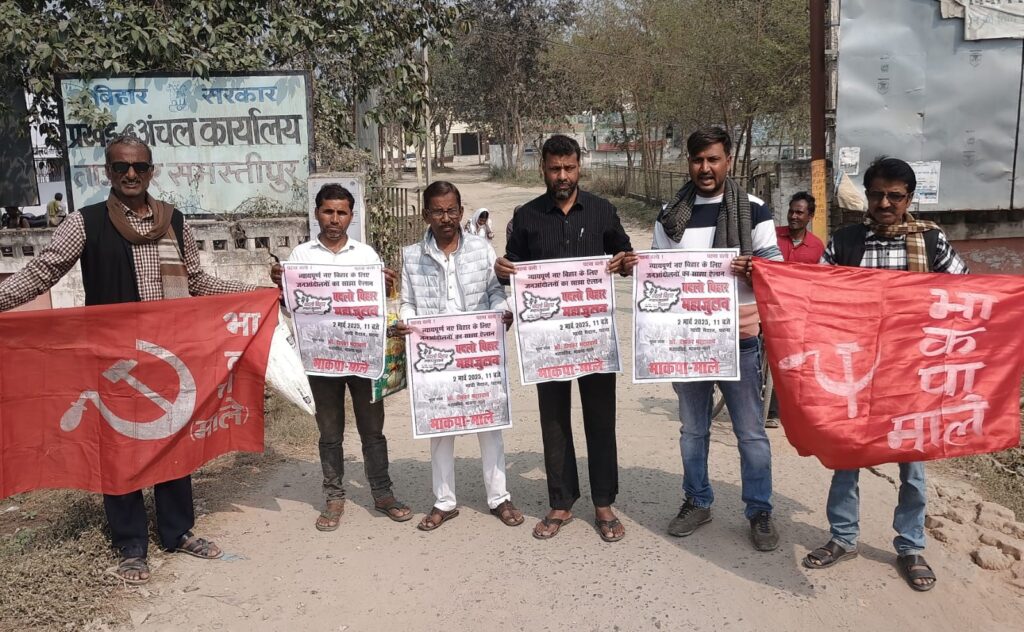 शुक्रवार को भाकपा माले कार्यकर्ताओं ने प्रखंड मुख्यालय से जनसंपर्क अभियान की शुरुआत की। सभी गरीबों को 72 हजार रुपए से कम का आय प्रमाण-पत्र बनाने, आवास सूची में नाम जोड़ने, भूमिहीन को वासभूमि एवं सरकारी जमीन पर बसे को पर्चा देने, 2 सौ यूनिट बिजली फ्री देने, महिलाओं को 3 हजार रूपए देने, वृद्धावस्था, मोसमाती एवं दिव्यांग पेंशन की राशि 3 हजार रूपए करने, प्रति यूनिट 15 किलो राशन देने, स्कीम वर्कर्स को राज्य कर्मी का दर्जा देने आदि मांगों से संबंधित नारे लगाते हुए जुलूस बाजार क्षेत्र का भ्रमण कर राजधानी चौक पर सभा में तब्दील हो गया। सभा की अध्यक्षता प्रखंड सचिव सुरेंद्र प्रसाद सिंह ने की। उन्होंने उपस्थित लोगों को संबोधित करते हुए कहा कि ताजपुर समेत मानवता को शर्मशार करने वाली घटना थूककांड के आरोपी बीडीओ गौरव कुमार पर जिलाधिकारी एवं सरकारी पूर्व समझौतानुसार कारवाई करे अन्यथा आंदोलन तेज किया जाएगा। माले नेता ने ताजपुर के तमाम राजनीतिक दलों, संगठनों एवं जनप्रतिनिधियों से थूककांड के लिए न्याय की मांग को लेकर संघर्ष का रूख अख्तियार करने की अपील की। मौके पर नौशाद तौहीदी, मो० एजाज, मो० क्यूम, प्रभात रंजन गुप्ता, ब्रह्मदेव प्रसाद सिंह, संजीव राय, रवींद्र राय, मुकेश कुमार गुप्ता आदि मौजूद थे।