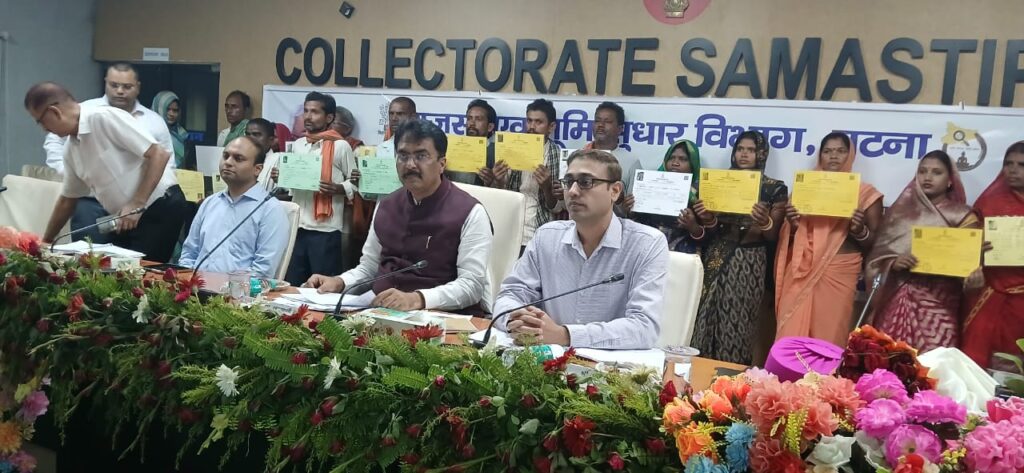 माननीय मंत्री राजस्व एवं भूमि सुधार विभाग बिहार पटना श्री संजय सरावगी की अध्यक्षता में समाहरणालय सभागार समस्तीपुर में दिनांक 22 मई 2025 को राजस्व एवं भूमि सुधार विभाग की समीक्षात्मक बैठक आयोजित की गई। सर्वप्रथम अपर समाहर्ता समस्तीपुर श्री अजय कुमार तिवारी द्वारा माननीय मंत्री राजस्व एवं भूमि सुधार विभाग तथा सचिव राजस्व एवं भूमि सुधार विभाग को पुष्प गुच्छ एवं अंगवस्त्र देकर सम्मानित किया गया। इसके पश्चात माननीय मंत्री महोदय के कर कमलो द्वारा विभिन्न लाभूको के बीच पर्चा वितरण किया गया , जिसमे समस्तीपुर अंचल अंतर्गत श्री शिवजी राम, श्री बिंदेश्वर राम ,श्री चंदेश्वर राम, खानपुर अंचल अंतर्गत श्रीमती रिंकू देवी, दिनमनपुर, पूसा अंचल अंतर्गत श्री गुड्डू पासवान, चंदौली ,श्री नरेश पासवान चंदौली, दलसिंहसराय अंचल अंतर्गत श्री सुधीर सहनी ,मोहम्मद सलखन्, श्री सुजाता देवी ,मोहम्मद सलखन्,नी उजियारपुर अंचल अंतर्गत श्रीमती सरिता देवी ,रायपुर, श्री चुनचुन पासवान ,रायपुर श्री रविंद्र पासवान रायपुर, हसनपुर अंचल अंतर्गत श्रीमती माधुरी देवी ,दुधपुरा, श्रीमती राम सखी देवी, दुधपुरा, विथान अंचल अंतर्गत श्रीमती नीलम देवी, सखवा ,श्रीमती निर्मला देवी, सखवा, श्रीमती बबली देवी ,सखवा तथा मोहिउद्दीन नगर अंचल अंतर्गत श्री सोफिंदर पासवान, दुबहा, श्री लाल बहादुर पासवान, दुबहा, श्री सोहन राम कल्याणपुर बस्ती शामिल है। इसके पश्चात माननीय मंत्री द्वारा विस्तृत समीक्षात्मक बैठक की गई जिसके अंतर्गत उनके द्वारा निर्देश दिया गया कि गैर मजरुआ खास जमीन को विभागीय दिशा निर्देश के आलोक में चिन्हित कर आवश्यक कार्रवाई करना सुनिश्चित करेंगे ।इसके अलावा यह भी निर्देश दिया गया कि की राजस्व के प्रत्येक 10 मामले में से एक की जांच डीसीएलआर के द्वारा की जाएगी एवं उनके द्वारा रिपोर्ट प्रस्तुत किया जाएगा ।परिमार्जन प्लस के मामलों में विभागीय निर्देश के आलोक में कार्रवाई करने का निर्देश दिया गया ।इसके अलावा माननीय मंत्री जी द्वारा समीक्षा के क्रम में पाया गया की 6 हजार से 7000 ऐसे मामले हैं जिनका एक ही तिथि को नोटिस निर्गत है तथा सुनवाई की तिथि भी और उसके रिजेक्शन अथवा निष्पादन की तिथि भी उसी दिन है जो की प्रथम दृष्टया स्वीकार योग्य नहीं है अतः इसकी जांच करने का निर्देश दिया गया। साथ ही जिस दिन अंचलों में अत्यधिक मामले लंबित है उनमें 50 मामले तथा जहां कम लंबित है वहां 25 मामलों की जांच करवाने का निर्देश दिया गया। जमाबंदी लाॅक के संबंध में माननीय मंत्री जी द्वारा निर्देश दिया गया कि जो सरकारी जमीन नहीं है उसको अनलॉक किया जाना चाहिए इस दिशा में सभी डीसीएलआर, अंचल अधिकारी आवश्यक कार्रवाई करना सुनिश्चित करेंगे। परिमार्ज