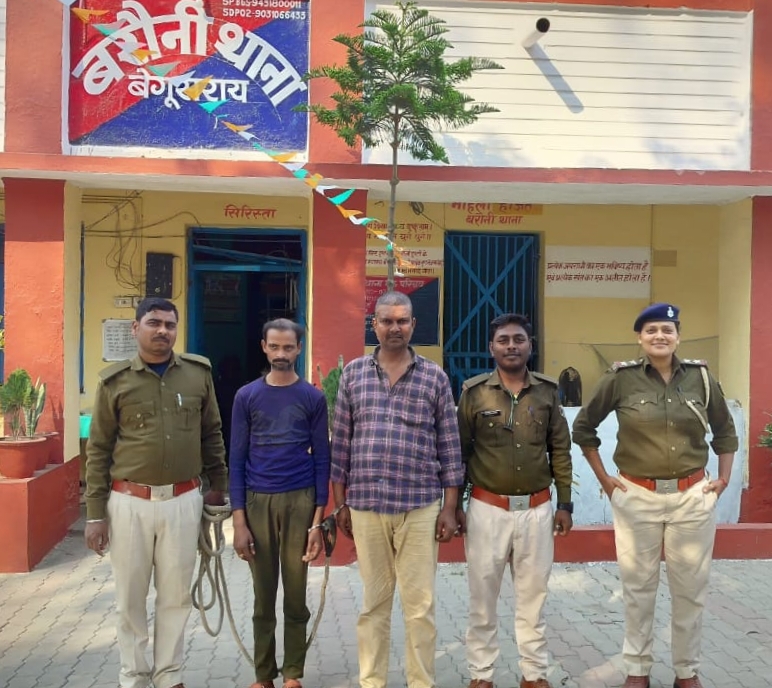 गुप्त सुचना के आधार पर सोमवार को तड़के दस बजे के करीब बरौनी थाना पुलिस ने त्वरित कार्रवाई करते हुए देशी शराब के दो धंधेबाजों को थाना क्षेत्र अंतर्गत पिपरा चौक पर से गिरफ्तार कर लिया। मिली जानकारी अनुसार देशी शराब के दो धंधेबाज एक ई रिक्शा के सहारे शराब ढुलाई का कार्य कर रहा था। जिसकी गुप्त सुचना पुलिस को मिल गई। पुलिस के हत्थे चढ़े दोनों धंधेबाज तेघड़ा थाना क्षेत्र अंतर्गत किरतौल निवासी है। जिसमें एक आरोपी रामचन्द्र चौरसिया का पुत्र दिलीप चौरसिया बताया जाता है तथा दुसरा मो उस्मान का पुत्र मो खालिद है। वहीं इस संबंध में जानकारी देते हुए थानाध्यक्ष बरौनी रंजन कुमार ठाकुर ने बताया कि ई रिक्शा से पकठौल से बरौनी की तरफ जा रहा था तभी मामले में त्वरित कार्रवाई करते हुए पुलिस अवर निरीक्षक जितेन्द्र कुमार सिंह द्वारा पिपरा चौक पर धर दबौच लिया गया। पकड़ाए आरोपी के पास से 30 लीटर देशी शराब, एक ई रिक्शा बरामद कर लिया गया है। मामले में थाना कांड संख्या- 32/25 दर्ज कर पुलिस अवर निरीक्षक लक्ष्मी श्री द्वारा अनुसंधान शुरू कर दिया गया है। जिसमें अग्रेत्तर कारवाई करते हुए दोनों आरोपियों को न्यायालय भेज दिया गया है।