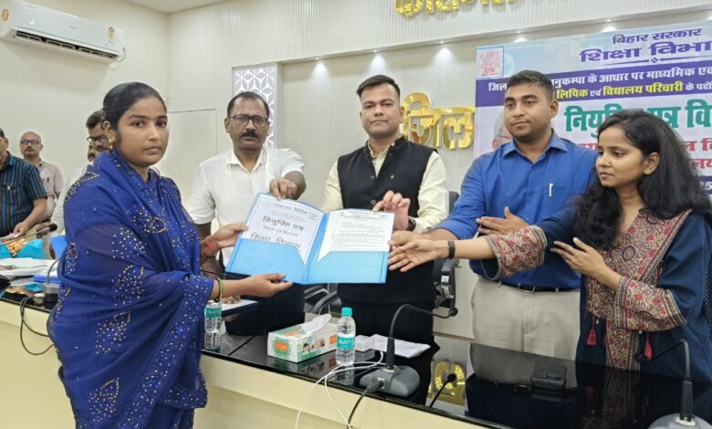 समाहरणालय स्थित कारगिल विजय भवन में शिक्षा विभाग द्वारा अनुकम्पा के आधार पर माध्यमिक एवं उच्च माध्यमिक विद्यालय में लिपिक एवं विद्यालय परिचारी के पदों पर चयनित अभ्यर्थियों को नियुक्ति पत्र प्रदान किए गए।इस अवसर पर जिला पदाधिकारी बेगूसराय तुषार सिंगला द्वारा कुल 115 अभ्यर्थियों को नियुक्ति पत्र वितरण किया गया।कार्यक्रम में उप विकास आयुक्त प्रवीण कुमार, जिला शिक्षा पदाधिकारी बेगूसराय मनोज कुमार, जिला कार्यक्रम पदाधिकारी (सर्व शिक्षा) सहित अन्य पदाधिकारी एवं अभ्यर्थी उपस्थित थे।