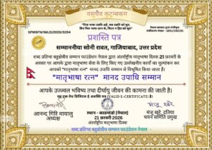 बृज विहार, गाजियाबाद की प्रसिद्ध कवयित्री सोनी रावत को नेपाल से मिला मातृभाषा रत्न अंतर्राष्ट्रीय मानद उपाधि सम्मान