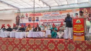 सूर्य कवि दादा लख्मीचंद आश्रम गाॅंव उमरावत में आयोजित पाॅंच दिवसीय सांस्कृतिक कार्यक्रम ‘म्हारी संस्कृति म्हारा स्वाभिमान’ में रोहतक से पधारे वरिष्ठ साहित्यकार आदरणीय डाॅ. मधुकांत जी, प्रो. शामलाल कौशल जी, सत्यवीर निराला जी एवं डॉ अर्चना कोचर को मंच पर पगड़ी पहनाकर मोमेंटो एवं नगद राशि से सम्मानित किया गया। कार्यक्रम की शुरुआत बहन सुशीला जांगड़ा जी की सरस्वती वंदना से हुई। हरियाणा संस्कृति की शान सॉन्ग प्रस्तुति के साथ रोहतक व जींद से पधारे साहित्यकारों ने काव्य पाठ द्वारा श्रोताओं को मंत्र मुग्ध किया। कार्यक्रम की अध्यक्षता हनुमान कौशिक जी तथा मंच संचालन धर्मवीर नगर जी द्वारा किया गया। मंचासीन वशिष्ठ अतिथियों में डाॅ.मधुकांत जी, प्रो.साहब शामलाल कौशल जी, डॉ सत्यवीर निराला जी, डॉ अर्चना कोचर जी, श्री जगदीश पांचाल जी, श्री ओम प्रकाश चौहान जी एवं बहन सुशीला जांगड़ा जी रही।
