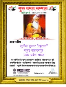 कवि स्पर्श साहित्यिक मंच भारत के संस्थापक महोदय श्री राम राय ने सुनील कुमार “खुराना” की साहित्य और सभ्यता को समर्पित भावना से प्रेरित होकर “महर्षि वेदव्यास सम्मान 2025” से अलंकृत किया है।