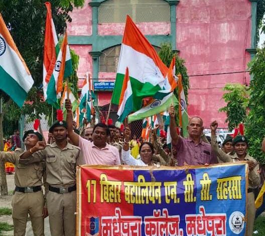 17 बिहार बटालियन एनसीसी और मधेपुरा कॉलेज, मधेपुरा के संयुक्त तत्वावधान में बुधवार को कॉलेज परिसर स्थित बिंदेश्वरी सभागार से भूपेंद्र नारायण मंडल विश्वविद्यालय परिसर तक भव्य तिरंगा यात्रा निकाली गई। इस यात्रा को रवाना करने का नेतृत्व श्री कृष्ण विश्वविद्यालय के कुलपति एवं मधेपुरा कॉलेज के संस्थापक प्रधानाचार्य डॉ. अशोक कुमार, मधेपुरा कॉलेज की प्रधानाचार्य डॉ. पूनम यादव, एनसीसी पदाधिकारी मेजर डॉक्टर गौतम कुमार और विमेंस कॉलेज कौशल्याग्राम के सहायक प्राध्यापक डॉ. हर्ष वर्धन सिंह राठौर ने संयुक्त रूप से किया।