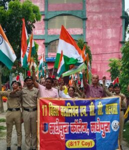 17 बिहार बटालियन एनसीसी और मधेपुरा कॉलेज, मधेपुरा के संयुक्त तत्वावधान में बुधवार को कॉलेज परिसर स्थित बिंदेश्वरी सभागार से भूपेंद्र नारायण मंडल विश्वविद्यालय परिसर तक भव्य तिरंगा यात्रा निकाली गई। इस यात्रा को रवाना करने का नेतृत्व श्री कृष्ण विश्वविद्यालय के कुलपति एवं मधेपुरा कॉलेज के संस्थापक प्रधानाचार्य डॉ. अशोक कुमार, मधेपुरा कॉलेज की प्रधानाचार्य डॉ. पूनम यादव, एनसीसी पदाधिकारी मेजर डॉक्टर गौतम कुमार और विमेंस कॉलेज कौशल्याग्राम के सहायक प्राध्यापक डॉ. हर्ष वर्धन सिंह राठौर ने संयुक्त रूप से किया।