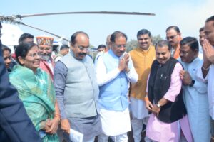 दुर्ग, 06 फरवरी 2026/ मुख्यमंत्री श्री विष्णु देव साय के दुर्ग प्रथम बटालियन हेलीपैड आगमन पर जनप्रतिनिधियों एवं अधिकारियों ने आत्मीय स्वागत किया। मुख्यमंत्री श्री साय के साथ उप मुख्यमंत्री श्री अरुण साव, स्वास्थ्य मंत्री श्री श्याम बिहारी जायसवाल पहुंचे। इस दौरान स्कूल शिक्षा मंत्री श्री गजेन्द्र यादव, उपाध्यक्ष छत्तीसगढ़ राज्य ग्रामीण विकास एवं अन्य पिछड़ा वर्ग आयोग एवं ग्रामीण विधायक श्री ललित चंद्राकर, अहिवारा विधायक श्री डोमन लाल कोर्सेवाड़ा, महापौर श्रीमती अलका बाघमार, जिला पंचायत अध्यक्ष श्रीमती सरस्वती बंजारे, संभागायुक्त श्री सत्यनारायण राठौर, कलेक्टर श्री अभिजीत सिंह, एसपी श्री विजय अग्रवाल एवं गणमान्य नागरिकों ने स्वागत किया।